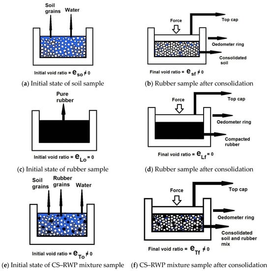 Considering the presence of rubber in the mixture, the compaction behavior of the specimens differed from that of the pure soil. To evaluate the effect of rubber on the consolidation and swelling, three consolidation tests were conducted on different specimens. In the first experiment, the pure soil was tested following saturation (Figure 7a,b). The second test focused on the consolidation and swelling of the pure rubber, given its high elasticity (Figure 7c,d). The third experiment involved testing clay–rubber mixtures with varying clay contents, as specified in Table 3. The rubber waste powders (RWPs) with different levels (contents) were mixed accordingly. Figure 7 illustrates the initial and final void ratios obtained from these tests, providing valuable insights into the behavior of the clay–rubber mixtures.