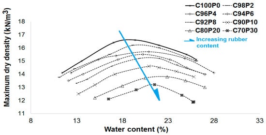 Figure 8 shows the standard compaction diagrams of the specimens containing different levels of RWPs. It is evident that the Maximum Dry Density (MDD) of the pure soil is 16.3 kN/m3, and the Optimum Moisture Content (OMC) is 18.5%. As the rubber content is increased, the OMC also increases while the MDD decreases. For instance, at a rubber content of 30%, the MDD and OMC are 13.2 kN/m3 and 21%, respectively. This reduction in mixture density can be attributed to the lower density of the rubber powder compared to the pure CS. Adding rubber to clay reduces the unit weight of the soil, which can significantly reduce the pressure caused by embankment in the mixture and lower implementation costs. Similar trends have been reported in the literature for the MDD and OMC in clay–rubber mixtures [,,,].