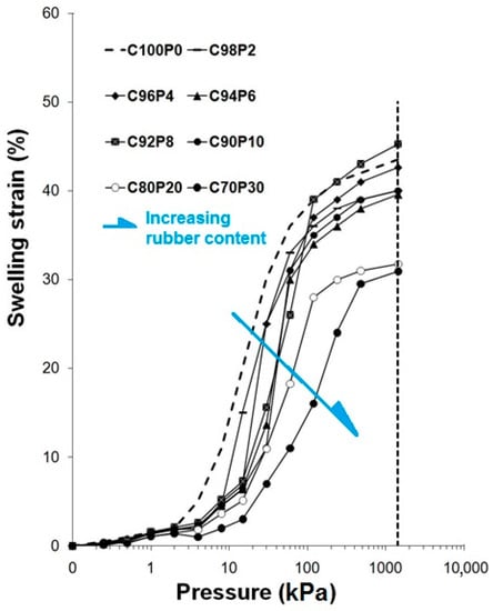 - Swelling Potential and free swelling: The swelling potential of specimens containing rubber powder was lower than that of the natural clay, indicating a reduction in the swelling strain of the mixture. Free swelling also decreased with an increase in rubber content. For rubber contents above 20%, free swelling remained almost constant;