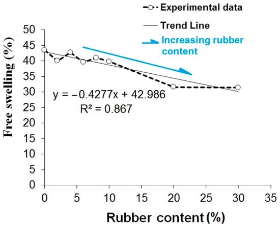 After conducting the consolidation tests, the swelling strains were evaluated, and the results are presented in Figure 9. As the rubber content is increased, the mixture color becomes darker. Figure 9 displays the swelling strains of the specimens with different rubber levels. It is evident that the specimens containing rubber powder exhibit lower swelling strains compared to the natural CS, indicating a reduction in the swelling strain of the mixture. Figure 10 illustrates the changes in the free swelling as a function of the rubber content. The swelling strain of the pure soil after 24 h is 45% while the soil containing 2%, 4%, 6%, 8%, 10%, 20%, and 30% rubber exhibits swelling strains of 40%, 42%, 39%, 45%, 39%, 31%, and 31%, respectively. It is observed that the use of rubber causes a reduction in the free swelling of the natural CS and ultimately improves the geotechnical properties of the mixture induced by clay swelling. This reduced swelling in the rubber-containing mixtures can be attributed to the rubber’s lack of water absorption and, consequently, no swelling. Moreover, the clay content in the mixture decreases with an increase in the rubber content, contributing to the overall drop in clay swelling.