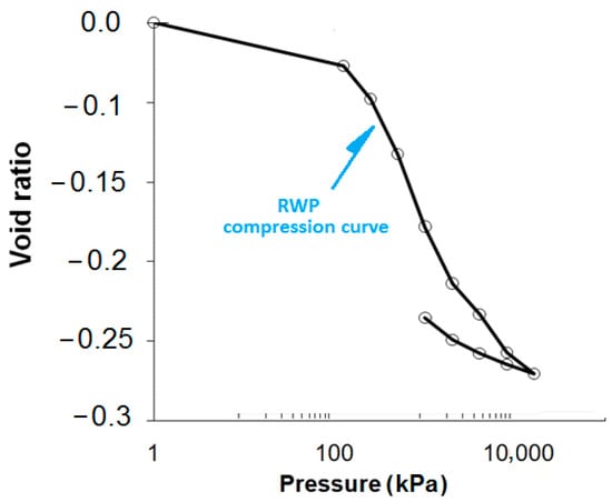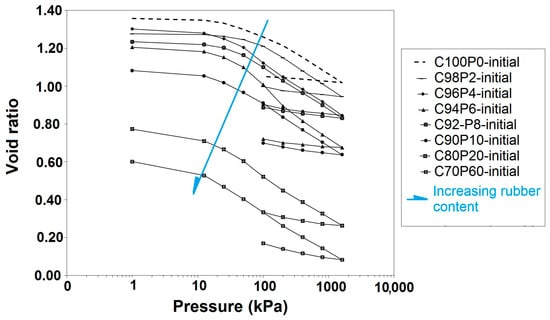 The e-log p’ curves were employed to assess the effect of rubber on the consolidation properties of the pure soil. Figure 11 presents the e-log p’ curves for the clay–rubber mixture at different rubber contents, plotted according to ASTM D2435 [] standards, assuming the same void ratio for both the clay–rubber mixture and the natural CS. A downward trend is further observed with increasing the rubber content, and the void ratio of the specimens decrease relative to the natural clay.