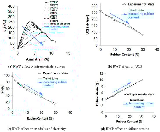 Figure 14d displays the axial strain diagram based on the percentage of RWPs. It can be seen that increasing the amount of rubber increases axial strains. This trend is opposite to the trend of resistance changes with increasing rubber percentage. The failure strain in pure soil is equal to 4.1%. The amount of failure strains increases to 6.2, 8.1 and 10%, respectively, by increasing the amount of rubber by 10, 20, and 30%.