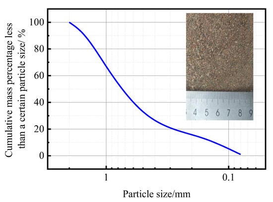 The experiment tailings were collected from a large uranium tailings pond in Hunan Province, China. The size of the uranium tailing particles is relatively uniform, mainly being translucent granular minerals with metallic luster and little debris. Impurities such as quartz can be seen. The hardness of the tailings can be felt by kneading them by hand. The relative density of the uranium tailings is 2.53, with a natural dry density of 1.446 g/cm3 and a void ratio of 58.8%. In order to determine the primary parameters of particle size for uranium tailings, a series of particle analysis tests were conducted on the tailing sand. Based on the test results, the cumulative curve of particle size distribution of tailings is drawn, as shown in Figure 1. According to the curve, the relevant parameters of tailings particle size were determined, such as the restricted particle size d60 = 1.00 mm, effective particle size d10 = 0.16 mm, median particle size d30 = 0.5 mm, inhomogeneity coefficient CU = 6.25 > 5, and curvature coefficient CC = 0.15625 > 1. According to the Standard for Engineering Classification of Soil, the size distribution of uranium tailings is continuous and particle size distribution is good [].
