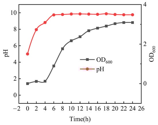 The change in pH significantly impacts the physiological metabolic activities and nutrient absorption abilities of Sporosarcina pasteurii. Moreover, pH has a more significant impact on intracellular and extracellular urease activity produced during bacterial metabolism. Therefore, the biochemical characteristics of the bacteria are reflected by measuring the pH and the bacterial cell density OD600 value of the bacterial liquid. Every 2 h, the pH of the bacterial solution was measured, while the OD600 value was measured using a protein–nucleic acid analyzer. According to the test results, the growth and pH change curves of the bacteria were drawn and are shown in Figure 3.