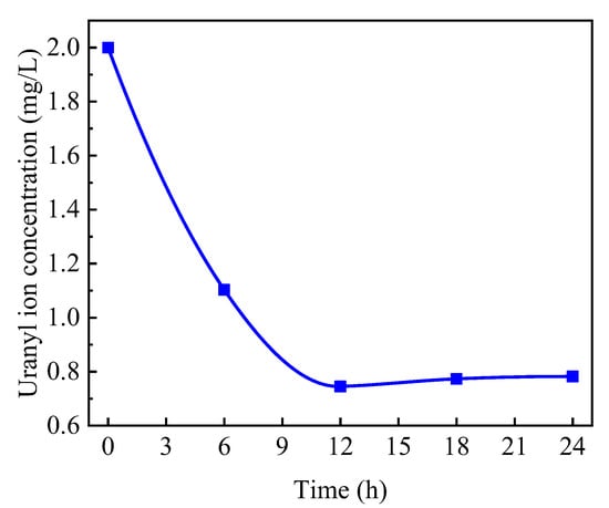 The uranium concentration in the solution was measured every 6 h during the reaction, and the results are shown in Figure 4. According to Figure 4, the uranium concentration significantly decreases within the first 10 h and slightly increases after 12 h. This is because some uranium was adsorbed in the form of unstable combinations of anions and cations, resulting in a small amount of solidified uranium being reintroduced into the solution over time. When the reaction time was 24 h, the rate of uranium removal was 60.9%.