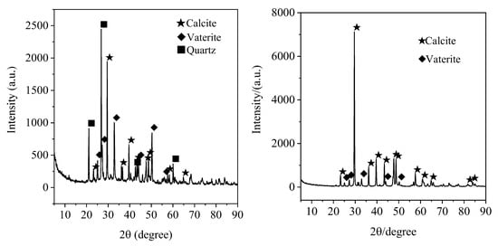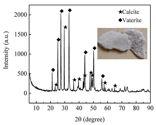 After the reaction, the resulting crystal precipitate was washed, dried, and weighed, yielding a mass of 4.226 g. The crystalline products appeared slightly yellow and white under visual observation, with stacked and arranged crystals, large particle agglomeration and interparticle stacking connections, dense crystal–crystal stacking, rich pores, a uniform crystal texture, and good structure. The mineralized products were taken for XRD test analysis, and the results are shown in Figure 5. Figure 5 shows that the crystalline product is calcium carbonate crystals, which contain crystalline forms of calcite and vaterite.