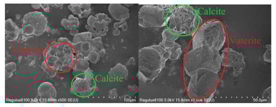 It is clear from the SEM image of calcium carbonate crystal that the generated crystal is mainly composed of vaterite with regular and uniform shape and calcite with various shapes (massive and granular) and uneven grain size. Vaterite and calcite are embedded and distributed, stacked in clusters, and bonded together. The image results are consistent with the XRD detection results of mineralized products in the solution experiment.