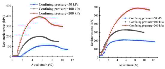 The strain-controlled triaxial apparatus based on the Mohr–Coulomb strength theory (as shown in Formula (1)) was utilized for the undrained shear test. Confining pressures of 50 kPa, 100 kPa, and 200 kPa were set, and the axial force was applied immediately after the specimen became stable, resulting in the tailings specimen’s shear failure under undrained conditions. During the test, critical parameters, such as the shear strength index of tailings, were monitored and analyzed, and their cohesion and internal friction angle were calculated. The stress–strain curves of tailing samples strengthened by each group of tailings under the consolidated undrained triaxial shear test are depicted in Figure 7.