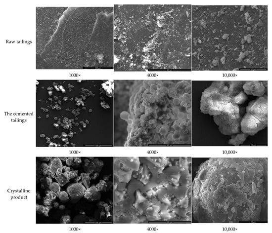 The SEM image of the cemented sand shows that after cementation, many calcium carbonate crystals adhere to the surface of the tailings, and the crystals are stacked and arranged. Particle aggregation is clearly visible, uneven, and porous. From the 4000× image, it can be seen that calcium carbonate almost completely covers the tailing particles. This coverage and cementation form an intricate stacking pattern that is irregular in connection and stacking, which is beneficial for improving compactness and enhancing the consolidation effect.