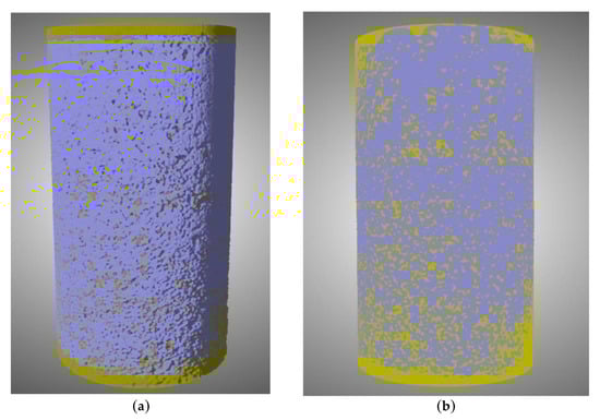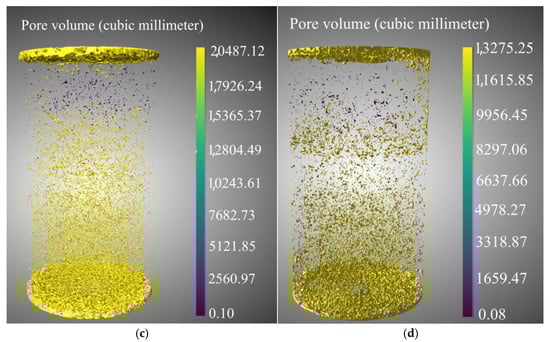 After being treated with microbial grouting, the uranium tailing samples were scanned using computed tomography (CT) technology. Three-dimensional imaging was utilized to extract information on porosity and particle characteristics, allowing for the analysis of microscopic processes and quantitative characterization of structural changes during the grouting process []. The scanned sample data were reconstructed in three dimensions using visualization software to obtain the 3D pore image of the tailing column, as shown in Figure 10. From Figure 10, it can be observed that the pore size and number of tailing samples after 8 days of grouting are significantly greater than those after 12 days of reinforcement. It can also be seen from the figure that the pore volume in the upper part of the sand column is smaller than that in the lower part.