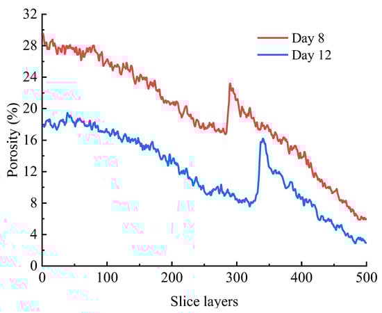 According to the statistical analysis shown in Figure 11, The variation interval of layer-by-layer porosity for 8 days of grouting ranged from 4.94% to 29.59%, with an average value of 18.85%. Similarly, after 12 days of grouting, the porosity ranged from 2.51% to 19.477%, with an average value of 11.75%. It can be observed from Figure 10 and Figure 11 that the porosity of the tailing column within the same region increases and then decreases with grouting time, indicating that microbial grouting reinforcement significantly affects porosity. Furthermore, the porosity gradually decreases from the bottom to the top of the tailing column with the increase in the number of Z-axis slices, mainly due to slurry being injected from the upper part of the column and penetrating downward layer-by-layer, resulting in the higher accumulation of calcium carbonate precipitates in the upper part than in the lower part. This is consistent with the previous results shown in Figure 10.