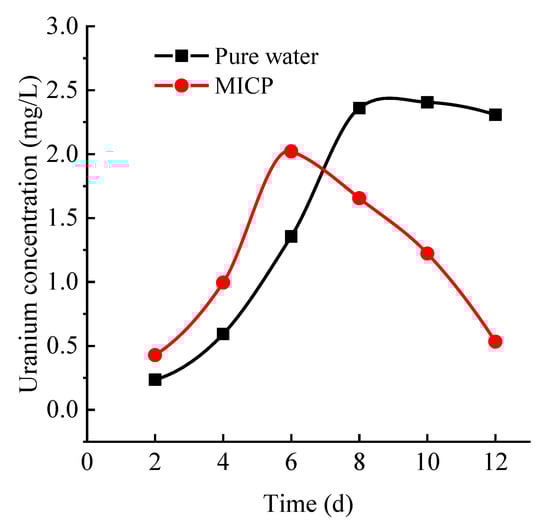 To investigate the effect of microorganisms on the immobilization of radioactive uranium in uranium tailings during microbial mineralization, the discharge solution was taken out to measure the uranium concentration every two days. The results are shown in Figure 12.