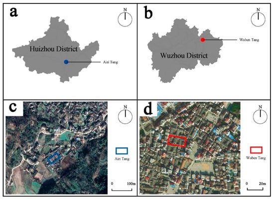 Geographical location relationship diagram of Airi Tang in Huizhou and Wuben Tang in Wuzhou: (a) the location relationship of Airi Tang in Huizhou region; (b) the location relationship of Wuben Tang in Wuzhou region; (c) the area where Airi Tang is located; and (d) the area where Wuben Tang is located.
