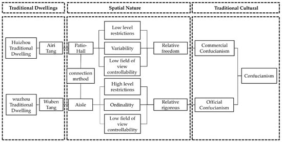 First, the data analysis was analyzed to verify the relationship between the spatial characteristic differences of Airi Tang and Wuben Tang and the different spatial connection forms; that is, the spatial data formed by the “courtyard–hall” connection and the “aisle” connection forms are significantly different. Then, a comparative analysis was conducted from three aspects—spatial layout, activity focus, and viewshed control of the two residential dwellings—and it is concluded that Airi Tang space has low hierarchical restriction, activity focus variability, low visual field control, and relatively free spatial nature. Wuben Tang space has high hierarchical restriction, consistency in the center of activities, high viewshed control, and relatively rigorous spatial nature. Finally, the corresponding relationship between the spatial nature of the two schools of residential dwellings and traditional culture was explored in combination with historical documents and other materials, and it is concluded that the difference in the spatial nature of the two schools of residential dwellings stems from the different influences of Confucianism for commercialization and Confucianism for officialization in traditional Confucian culture.