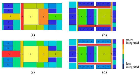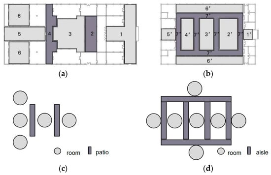 Integration of both Airi Tang and Wuben Tang layouts: (a) HH integration of Airi Tang; (b) HH integration Wuben Tang; (c) R3 integration of Airi Tang; and (d) R3 integration Wuben Tang. (1. front hall, 2. first patio, 3. middle hall, 4. second patio, 5. back hall, 6. Bedroom, 1′. front hall, 2′. first patio, 3′. middle hall, 4′. second patio, 5′. back hall, 6′. Bedroom, 7′. aisle).