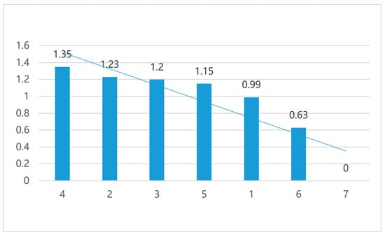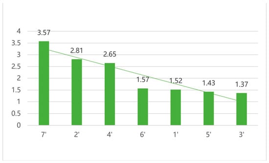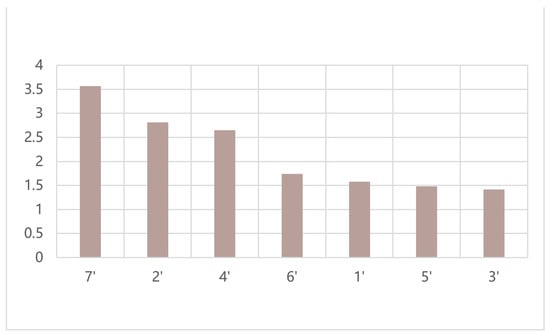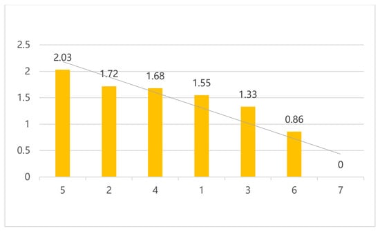 From Figure 11 and Table 4, it can be observed that the HH integration of Airi Tang is relatively smooth, with less fluctuation in value. On the other hand, the HH integration of Wuben Tang has more fluctuations and the difference in values is more pronounced. From the perspective of each space, the values of the aisle (traffic space) and the patio are larger, while the values of the rest of the non-traffic spaces are smaller, forming two ranges of high and low values. The highest value of HH integration is 3.57 for space 7′ (aisle), and the lowest is 1.37 for space 3′ (middle hall), with a difference of up to 2.2. In comparison, the HH integration of Wuben Tang’s space presents a large difference.