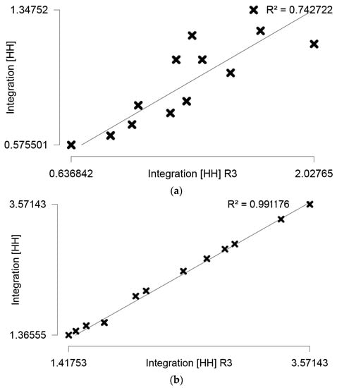 To compare and analyze the relationship between the HH integration and R3 integration of the two dwellings, a scatterplot was drawn by depthmap software. The horizontal co-ordinate was defined as R3 integration and the vertical co-ordinate was defined as HH integration. The intersections represent the different rooms in the residential house, and the value of the fit degree (R2) was calculated as shown in Figure 13. This was carried out to compare the values of the dwelling spaces more clearly, as shown in Table 5.