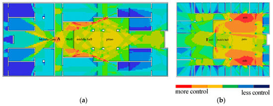 As can be seen from Figure 14, the color of the courtyard and the central hall of Airi Tang is warm, and the viewshed integration is high. The color of the space behind the dwelling screen wall is cold, and the viewshed integration is small. The color of the aisle and the first courtyard of Wuben Tang is warm, and the integration is high. The color of the space behind and around the screen wall of the dwelling is cold, and the viewshed integration is small. It can be seen that the sight lines of the two dwellings are blocked by the screen wall, which is set behind the central hall, and this often serves as a barrier to separate spaces, prevent spaces from being seen at a glance, block sight lines, weaken openness, increase spatial levels, and reflect the hierarchy in spatial perception. The sight lines blocked by the screen wall do not disappear completely, but converge to a point, becoming the center of vision. The center of the viewshed is also the area with the highest viewshed control [20], so starting from the center of the viewshed to analyze the vision of the dwelling can more comprehensively observe the vision of each space of the dwelling. For ease of description, we denote the center of the viewshed of Airi Tang as point A and Wuben Tang as point B.
