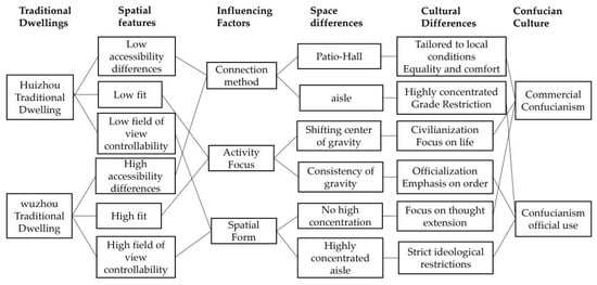 By analyzing the spatial layout of typical traditional dwellings in Huizhou and Wuzhou using space syntax and identifying the corresponding relationship between traditional dwellings and traditional culture in Figure 15, this paper finds that the connection mode, activity center, and spatial form in the spatial layout of traditional dwellings are the specific manifestations of the spatial characteristic differences of traditional dwellings. These differences are directly related to the fact that the Confucian culture of the two places is influenced by the two backgrounds of “commercialization” and “officialization”, and the two cultural forms of Confucian business and Confucian government are formed to give the traditional dwellings adaptability to the specific socio-cultural and natural environments. This verifies that the deep integration of Confucian culture and local culture can produce rich and diverse forms of traditional residential spatial layout on the basis of maintaining the mainstream architectural style in different cultural regions. This provides us with a more specific perspective in order to understand the relationship between culture and traditional residential spatial form. Exploring the influence of Confucian culture on the spatial layout of traditional dwellings in different regions can enrich the cultural research content of traditional dwellings. At the same time, the academic argument about the “similarity” of Hui-style and Wu-style traditional dwellings’ characteristics has been broken to a certain extent for a long time in the past, which has a positive significance for the research of the two schools of dwellings.