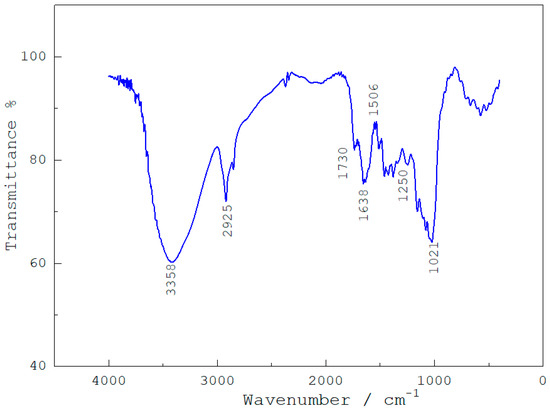 Figure 4 shows the concrete’s FTIR spectrum without adding Guadua angustifolia fibers. In the zone from 400 to 900 cm−1, small peaks are evident that confirm the formation of a geopolymer network between Si and Al, linked by oxygen bridges due to hydration processes. A band at 1021 cm−1 is related to the partial replacement of silicon by aluminum due to the composition of the steel slag and its addition to the mixture (80% by weight) [31]. The peak with the lowest intensity is related to the formation of the weak Al–O bond due to the dissolution of the precursor during geopolymerization and its subsequent reincorporation into the network, modifying the chemical environment of the bond. The band corresponding to the vibration at 1506 cm−1 is related to the carbonyl group’s bonding due to the slag’s CaO concentration [32]. This factor can be correlated with the mechanical properties of the concrete. The bands at 1638 and 1730 cm−1 are attributed to the reaction of SiO4−2 in the C–S–H bonds in the hydration of the concrete [33]. The peak at 2925 cm−1 indicates the presence of water and sodium hydroxide. The peak displacement below 3000 cm−1 is due to high concentrations of the alkaline activator. The peak at 3358 cm−1 corresponds to the reaction of the activator with the calcium sulfate present in the mixture.