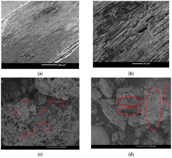 SEM micrographs. (a,b) Guadua angustifolia fiber, (c) concrete mix without guadua fiber reinforcement, and (d) concrete mix with guadua fiber reinforcement.