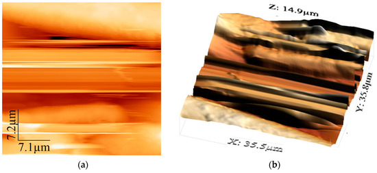 Morphology of Guadua angustifolia fibers obtained by AFM. (a) Two-dimensional, and (b) three-dimensional.