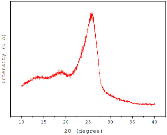 Figure 7 shows the diffractogram for the lignocellulosic samples analyzed by XRD. The samples show diffraction peaks related to the cellulosic fibers at position 25. 85° corresponds to the crystallographic plane (002). The other peak, with less intensity, is at 18.77° relative to the crystallographic plane [38]. These two peaks are related to the bands exhibited by the cellulose, indicating a high concentration of cellulose in the Guadua angustifolia fibers. Therefore, the XRD analyses allow us to infer that the chemical treatments lead to obtaining amorphous material, according to the intensity of the characteristic peak of the grid plane (002) and the depression in the peak at 18.77°.