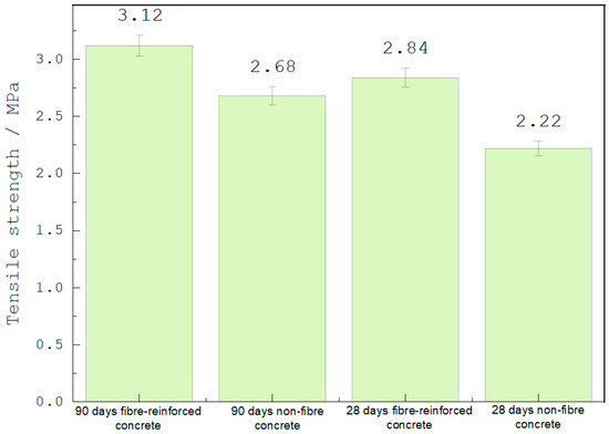 Figure 9 shows the results obtained in the tensile strength tests. The concrete samples’ highest tensile strength values were determined by mixing Guadua angustifolia fibers. After 28 days of curing, it was evident that concrete reinforced with guadua fibers increased resistance values by 28% compared to concrete without reinforcement [43]. Additionally, the study allowed increasing tensile strength at 90 days due to the incorporation of fly ash. At early ages, the fly ash fills the pores of the matrix. Therefore, at more prolonged periods of concrete evaluation, it was evident that the tensile strength values increased by 11% for mixtures with the addition of Guadua angustifolia fibers and 21% for mixtures without adding Guadua angustifolia fibers. This behavior is due to the slow pozzolanic reaction of the fly ash [29]. However, the slag hydrates more rapidly over time, improving tensile strength. The low reactivity values in concrete mixtures with the addition of fibers are due to the typical chemical reaction of the fibers concerning the other concrete components. It must be taken into account that reactions can occur, which can modify the total composition of the mixture, forming expansions and alkalinity between the added materials. As mentioned, adding fly ash delays hydration due to 28.8% aluminate ions, as shown in Figure 9. Steel slag provides adequate flexural strength at early ages (28 days). However, at tiny grain sizes and in the presence of moisture, the concrete mix chemically reacts with rice husk ash to form cementitious compounds. A pozzolanic reaction can only occur over time with a ternary mixture of fly ash, steel slag, and rice husk ash. Therefore, this rapid reaction is due to the incorporation of steel slag in additions of 80%, as shown by the results of other investigations.