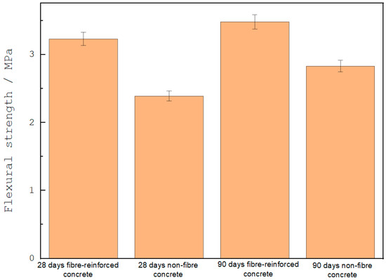 Figure 10 lists the flexural strength values for the concrete samples with and without the addition of Guadua angustifolia fibers at times of 28 and 90 days [37]. The results show that the mixture with the addition of Guadua angustifolia fibers showed the highest values in flexural strength at 90 days. For mixtures without fiber reinforcement evaluated at 90 days, it was found that the flexural strength was 19% higher compared to the mixture evaluated at 28 days. In addition, the flexural strength results showed a 7% higher flexural strength than the mix evaluated at 28 days. In general, adding fly ash, steel slag, and activation with rice husk ash results in lower flexural strength as a function of time, and adding Guadua angustifolia fibers in the mix increases flexural strength. The flexural resistance values of the concrete mixtures added with Guadua angustifolia fibers were the highest, regardless of the curing time. These results are in agreement with the trends found in the analysis of tensile strength, where it has been shown that cementitious compounds typically gain less resistance due to the addition of Guadua angustifolia fibers [42,44]. The results here show that adding fibers affects the ternary mixtures more. This effect is related to the pozzolanic reaction over time. However, it has been observed that, at ages after 28 days, ternary mixed concretes have very little long-term strength because the effect of adding reinforcing fibers on flexural strength is high for early ages.