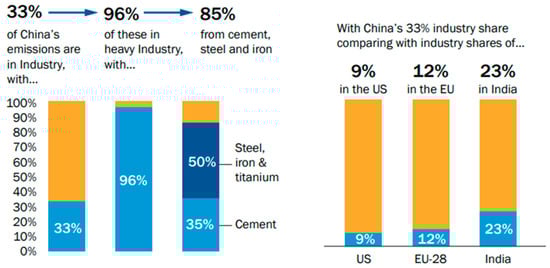 Figure 1 shows the share of industry in emissions in China compared with other countries. Although the overall percentage of industrial emissions is higher, cement and steelmaking is less energy-intensive compared with the G20 average. In China, education is observed to mitigate CO2 emissions [], as the proportion of services in the GDP is rising. It is reported that the total number of students who graduated from public colleges and universities in China is 8.3 million, and the enrolment rate in tertiary education was 57.8% in 2021, which is a remarkable increment compared to 1990, i.e., 3.4% (Ministry of Education, 2022). The government education expenditure has been inflating in recent years and reached CNY 3.95 trillion in 2022. Considering CO2 emissions and education together, the actual figures have opposed the contextual notion that education is mitigating the emissions as described by Li et al. []. Alongside this, the impact of education on pollutant emissions (not only CO2) has not been witnessed extensively in the Chinese context.