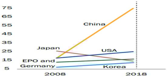 Upon realizing the importance of education in this regard, this study aims to investigate the impact of education on environmental sustainability. Another reason for studying this influence is that the Chinese government has been focusing seriously on environmental, industrial, technological, and financial policies and regulations regarding green transition. However, systematic guidelines for promoting green education have not been observed to be the point of focus of the government. The study incorporates the influence mechanisms of green innovation and government intervention to diversify the framework and the empirical results further. Green innovation is the leading environmental improvement factor. It helps control pollution and recycling through modern and advanced procedures and technologies []. Figure 2 displays how patents related to climate change have been intensified in China compared with other countries recently. Henceforth, green innovation can help industries to invest in educated, talented, and environmentally informed human capital to ensure a green transition. Likewise, government intervention in terms of environmental regulations, educational policies, educational expenditure, training of labor, etc., enhances education’s influence on environmental sustainability []. Furthermore, the study also examines how the level of education varies in the eastern, central, and western regions of China. The heterogeneity test is necessary to provide policy implications to induce talent and skills in the less developed area to achieve the SDGs and dual carbon goals promptly.