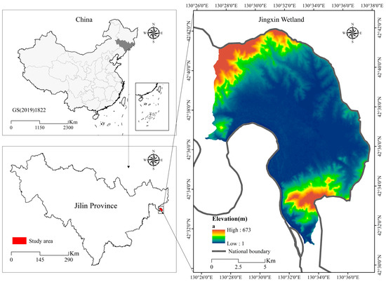 Jingxin Wetland (42°31′–42°42′ N, 130°26′–130°37′ E) is located in the lower reaches of the Tumen River Basin in China (Figure 1). The study area is near the Sea of Japan, with a relatively humid climate and windy spring and autumn. The rainy season is mostly concentrated in July and August, with annual rainfall of 823.7 mm, annual average temperature of 5.6 °C, extreme maximum temperature of 36.3 °C, extreme minimum temperature of −32.5 °C, and a frost-free period of 156 days. The terrain in the study area mainly includes plains and hills, with lakes and wetlands distributed all over the area, and the main stream of the Tumen River flows from west to east through Jingxin Wetland. In addition to its unique location, the wetland is rich in natural resources and exceptionally rich in animal species, retaining many of the region’s endemic species. In particular, it is an important species gene pool for wetland animals and a habitat for globally endangered waterfowl such as Grus japonensis and rare wildlife such as Panthera tigris altaica and Oncorhynchus keta [39,40,41].