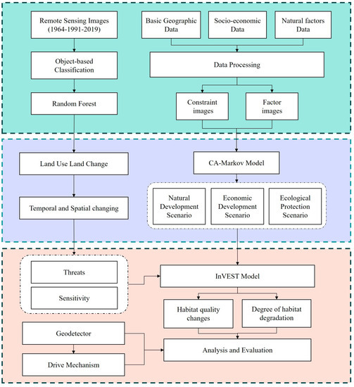 Habitat quality refers to the suitability of inland ecosystems for species survival and reproduction and economic development at a certain spatial and temporal scale [1]. It contributes to depicting the completeness and variety of terrestrial ecosystems [2], and also plays a substantial role in determining species’ distribution patterns and in regulating the spatial dynamics in fragmented landscapes [3]; the greater the habitat quality, the greater the biodiversity of the ecosystem [4]. Therefore, habitat quality assessment is an important means of determining the level of regional ecological security and health.