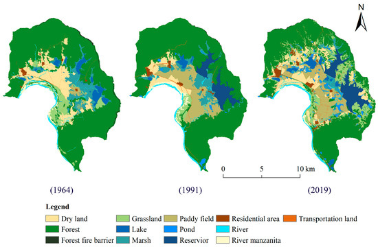 Spatial distribution of landscape types in 1964, 1991, and 2019 in Jingxin Wetland.