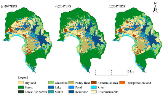 Projected results of landscape pattern in Jingxin Wetland in 2047 under different scenarios.