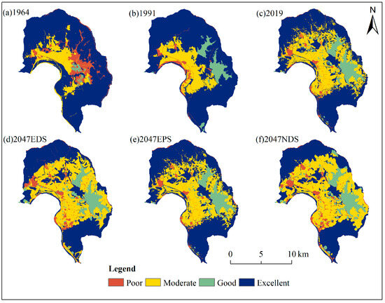 From 1964 to 2019, habitat quality in Jingxin Wetland was sensitive to the shift in wetland type, with the loss of natural wetlands being the most significant factor in the decline of habitat quality. The most distinct change in Jingxin Wetland was observed after the construction of the Longshan Reservoir in the 1980s, resulting in the conversion of natural wetlands such as large swamp wetlands and lake wetlands into artificial wetlands (Figure 4). The construction of reservoirs disrupts the hydrological connectivity between lakes and leads to shrinkage of the lake [55], but it also provides objective hydrological conditions for the reclamation of paddy fields; large areas of dry land were reclaimed as paddy fields, which is also related to the local population’s habit of eating rice [56]. LUCC alters the water recharge pathway of wetlands, reducing recharge by surface runoff. Human activities affect runoff regulation and the seasonal distribution of reservoirs, which also leads to the gradual reduction in wetland hydrological inflow. These changes in the water area affected the swamp landscapes distributed in Jingxin Wetland. Consequently, natural wetlands undergo degradation and wetland habitat quality declines, which further reflects the high explanatory power of the distance from the water for habitat quality in GeoDetector. From 1991 to 2019, influenced by anthropogenic water bundling, the area of pond and lake wetlands increased and wetland patches became more fragmented, both of which resulted in a decrease in the area of higher habitat quality and an increase in the extent of habitat degradation. The direct role of human activities on land use change has been made clearer through the validation of GeoDetector. The interaction of the human footprint with other factors has high explanatory power for habitat quality (Figure 10b), reflecting the trend of humans taking advantage of natural conditions and constantly pursuing socio-economic development, which exerts a significant impact on habitat quality. According to the projected results under different scenarios for 2047, the implementation of ecological protection measures can effectively control land use change, protect natural wetland resources, maintain habitat quality, and support a trend towards better ecological conditions. In contrast, under the natural development scenario and the economic development scenarios, wetland land use is more fragmented and habitat quality continues to decline. This corroborates the view that land use change in wetlands is a major factor influencing habitat quality [57].
