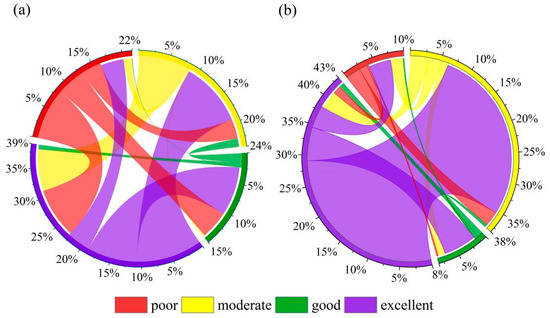 Habitat quality transfer chord diagram of Jingxin Wetland during 1964–2019. Note: (a) habitat quality transfer during 1964–1991; (b) habitat quality transfer during 1991–2019.