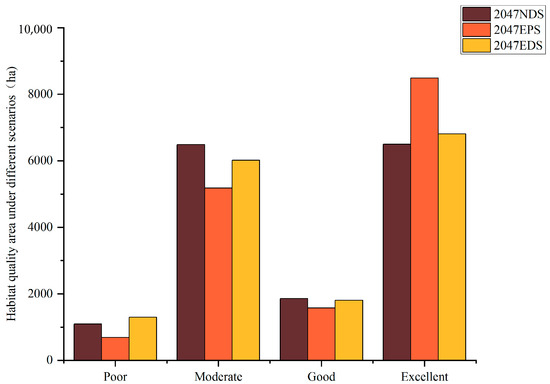 Significant differences can be observed in the area of habitat quality classes between scenarios in 2047 (Figure 8). The ecological protection scenario presents the largest area of excellent habitat quality and the smallest area of poor habitat quality. Habitat quality distribution patterns are similar under both the natural development and economic development scenarios. Nevertheless, there are also some characteristic differences in habitat quality due to the different focus of development, which has different impacts on landscape patterns. The economic development scenario has a larger area of poor grade habitat quality, whereas the natural development scenario shows a decrease in the area of excellent habitat quality, an increase in the area of moderate habitat quality, and a deterioration in the overall environmental ecological quality.