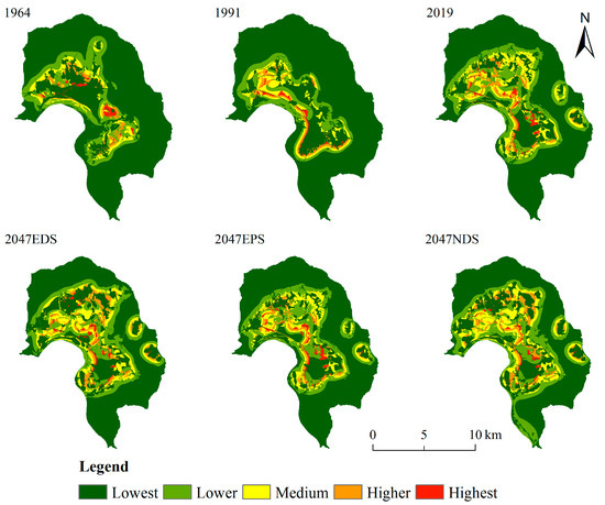 From 1964 to 1991, the area of lower and lowest degradation accounted for more than 90% of the total area, and the area of higher and highest degradation accounted for about the same percentage (Figure S3). From 1991 to 2019, the degradation pattern changed significantly, with the area of lower degradation and below shrinking to 84%, and the area of high degradation increasing to 10%. Habitat degradation shows little change under the future ecological protection scenario compared to 2019. Under the natural development scenario, the area of lowest degradation is the smallest and the areas of medium and higher degradation increase to 19%. Under the economic development scenario, the area of lowest degradation increases compared to the natural development scenario, and the area of highest degradation is the largest, increasing by 2%.