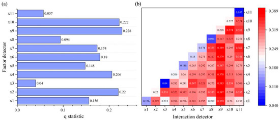 q statistical index and interaction results calculated using GeoDetector. Note: (a) q value of Factor detector; (b) Factor interaction detection results. x1 Soil, x2 Slope, x3 Rainfall, x4 Population density, x5 Gross Domestic Product, x6 Distance from water, x7 Distance from railway, x8 Distance from main road, x9 Human Footprint, x10 Digital elevation model, x11 Temperature.