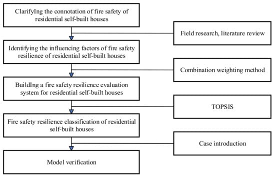 According to the combination weighting–TOPSIS method, the fire safety resilience evaluation model of residential self-built houses was developed, and four resilience levels were classified, which included poor, medium, good and excellent. The results showed that the fire safety resilience level of residential self-built houses was low, which was mainly manifested in the lack of coping and restoring learning ability.