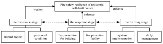 According to resilience theory and the objective situation of residential self-built houses in China, fire safety resilience of residential self-built houses is defined as follows: when exposed to fire hazard factors, the building itself can absorb and resist some external forces and take timely measures to maintain and restore the fire safety status of residential self-built houses. Specifically, it includes checking and monitoring disaster-causing factors before the fire occurs and providing timely warnings; quickly enabling firefighting facilities to self-adjust and repair in case of fire to minimize casualties; rapidly restoring infrastructure functions of residential self-built houses after the fire is over; and at the same time, making up for the shortcomings of the construction of the fire protection system through experiential learning.