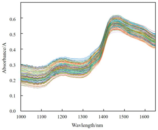 Figure 1 shows the near-infrared spectra of the water content for the 144 T. grandis kernel samples. It was observed that the characteristic groups of water content mainly had the overtone spectra of O–H bonds in the range from 1000 nm to 1650 nm. A study reported that the absorption peaks corresponding to the water content were located near 1170 nm and 1450 nm by comparing the spectral differences between 6,000 apple samples []. Similar results were observed for the absorption peaks corresponding to water content in corn stalk silage samples, which were around 1190 nm and 1450 nm []. As depicted in Figure 1, two obvious absorption peaks of water content-related groups were located at 1200 nm and 1470 nm, which laid the foundation for the calibration of the near-infrared quantitative model of the water content.