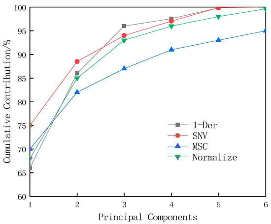 Cumulative contribution rate of the first six principal components of different preprocessed spectra.