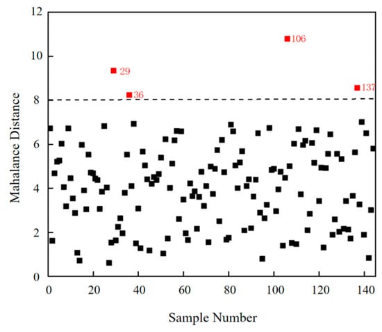 Mahalanobis distance distribution of the samples. The red squares represent abnormal samples after filtering by the Mahalanobis method while the black squares represent normal samples.