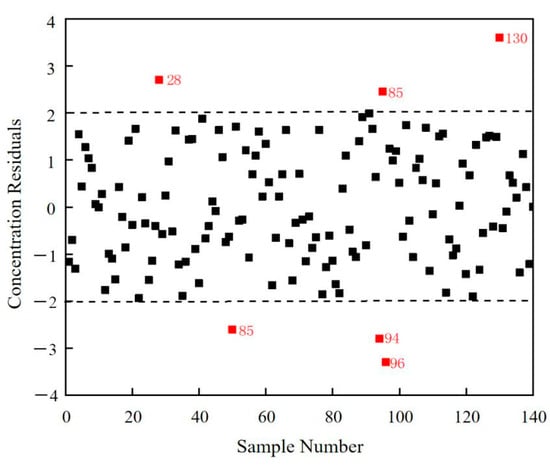 The concentration residual method determined outlier samples by detecting the ratio (F) of the variance of Res(i) to the average of the absolute error variance of the entire sample set []. The specific calculation equation was as follows: