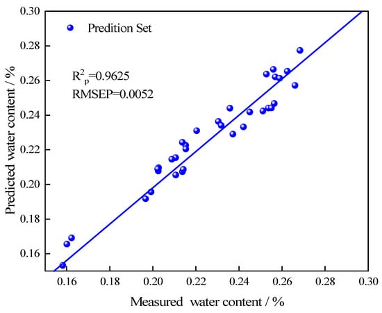 An external prediction set with 36 samples was performed to examine the accuracy of the calibration model. The prediction results are shown in Figure 6. It could be seen that the scatter plot was basically distributed on both sides of the fitting line without obvious deviation points, and the data prediction results were basically consistent with the measured results. The prediction correlation coefficient R2p of the T. grandis kernel water content was 0.9625, and the root mean square error of the prediction set (RMSEP) was 0.0052. The prediction correlation coefficient of the model was greater than 0.95, indicating that its prediction performance was excellent and could achieve accurate prediction.