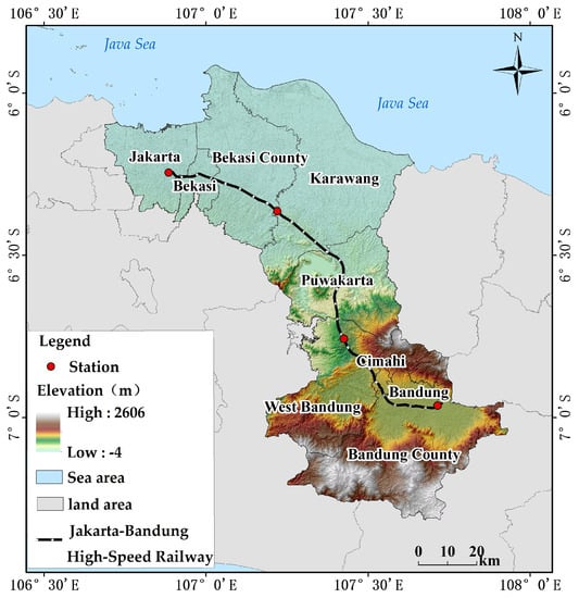 The JBHSR is located on the island of Java in Indonesia, connecting the capital city of Jakarta with the fourth-largest city, Bandung. The study area extends from 5°54 to 7°19 S and 106°42 to 107°54 E (Figure 1). The region has a tropical rainforest climate, with an average annual temperature ranging from 20 to 30 ℃. During the summer season, temperatures often exceed 30 °C, with the possibility of reaching 35 °C or higher. The relative humidity is relatively high, typically ranging from 70% to 90%. The area experiences seasonal climate variations. The rainy season is characterized by the northwest monsoon, with frequent rainfall, cloudy skies and thunderstorms. The dry season is dominated by the southeast monsoon, with more sunny days and less rainfall, creating a relatively dry climate. The region has diverse and complex landforms. The northern part is primarily composed of plains with relatively flat terrain, consisting of rivers, lakes and agricultural fields. The southern part is characterized by mountainous areas with higher elevations, steep peaks and winding valleys. The geological structure is also complex, with a significant presence of special types of soil and rock formations, such as soft soil, loose soil and volcanic sediment [36].