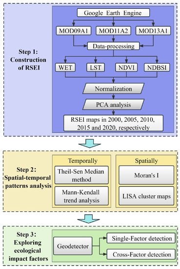 Figure 2 illustrates the comprehensive workflow employed in this study. First, the spatial distribution maps of the RSEI for 2000, 2005, 2010, 2015 and 2020 were computed using the GEE platform. Based on the obtained spatial distribution maps of RSEI, analyses were conducted from both temporal and spatial perspectives. Finally, Geodetector was employed to explore the factors influencing the EEQ.
