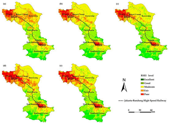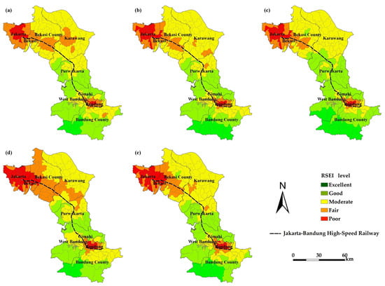 Map of the subdistrict-scale RSEI levels: (a) 2000, (b) 2005, (c) 2010, (d) 2015 and (e) 2020.